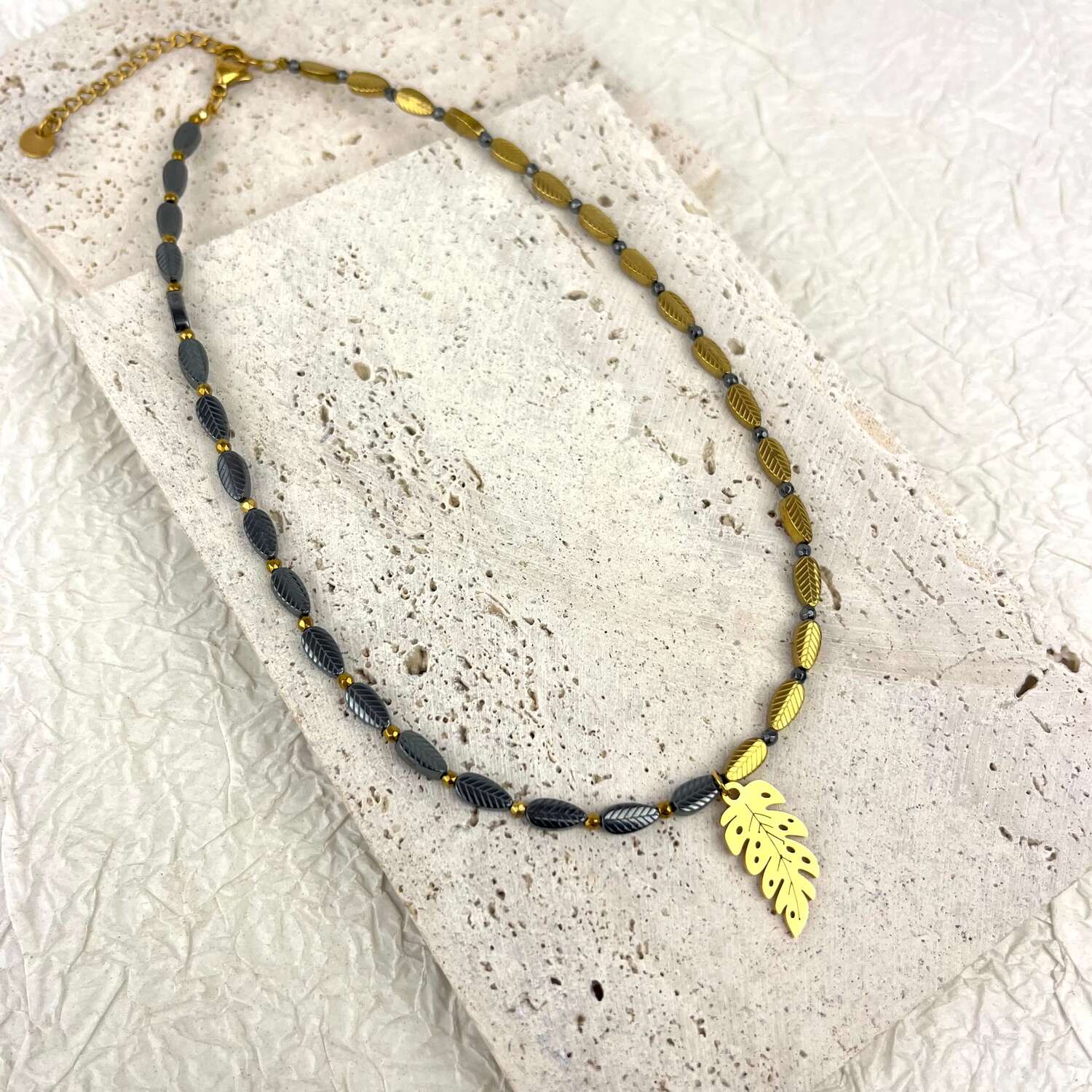 100% Χειροποίητο κολιέ με χρυσούς και μαύρους αιματίτες και ατσάλινο χρυσό στοιχείο φύλλο.