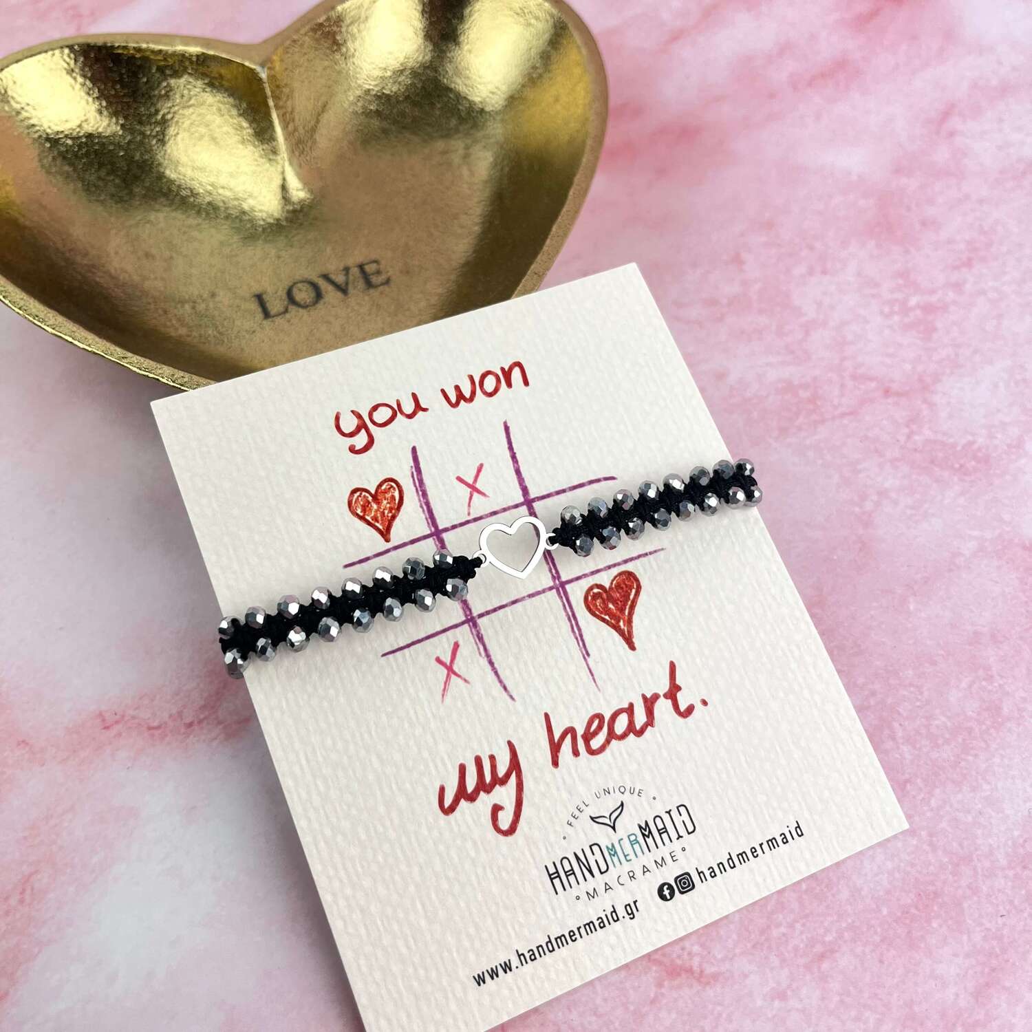 Χειροποίητο μακραμέ βραχιόλι με ατσάλινη καρδιά και κρύσταλλα, διαθέσιμο σε χρυσό και ασημί.