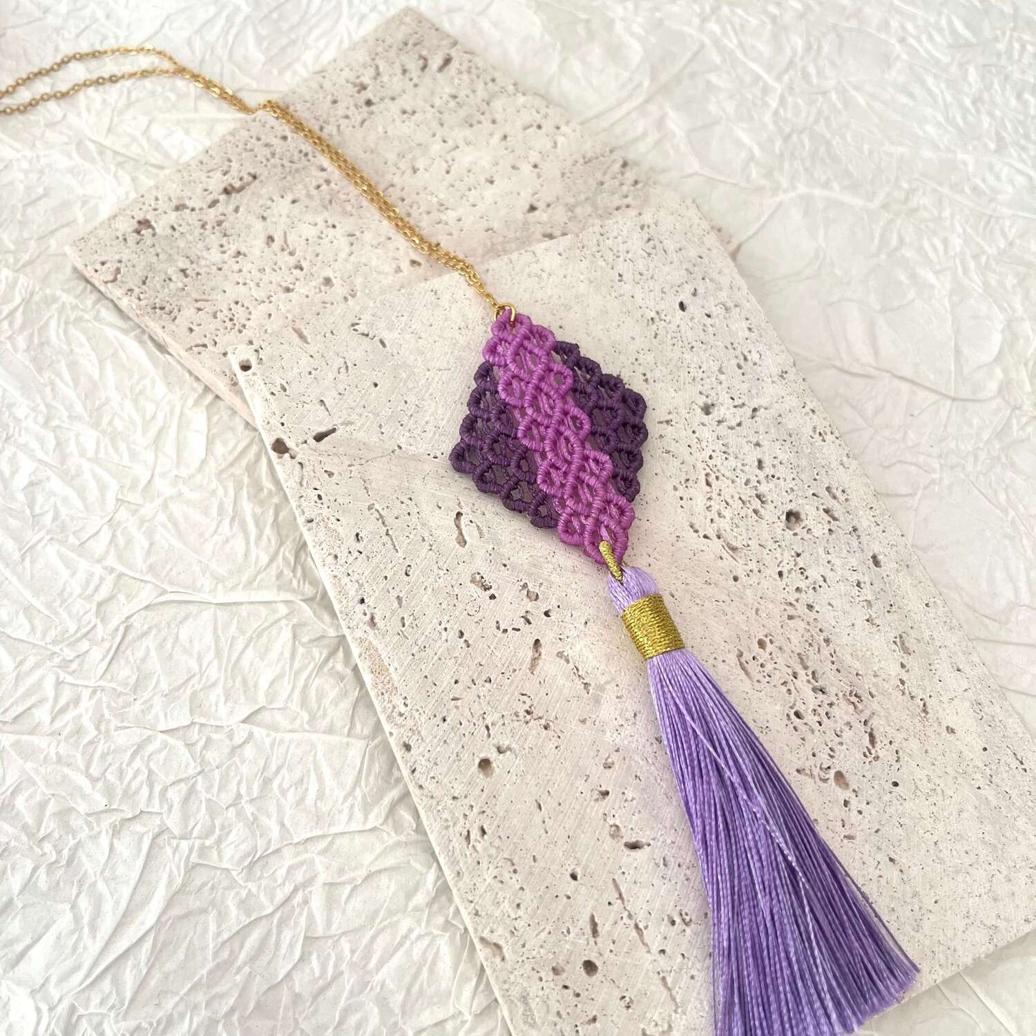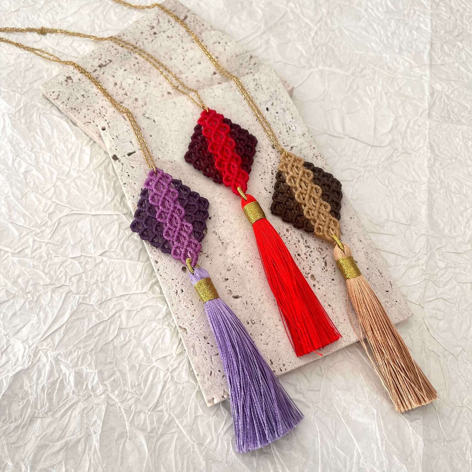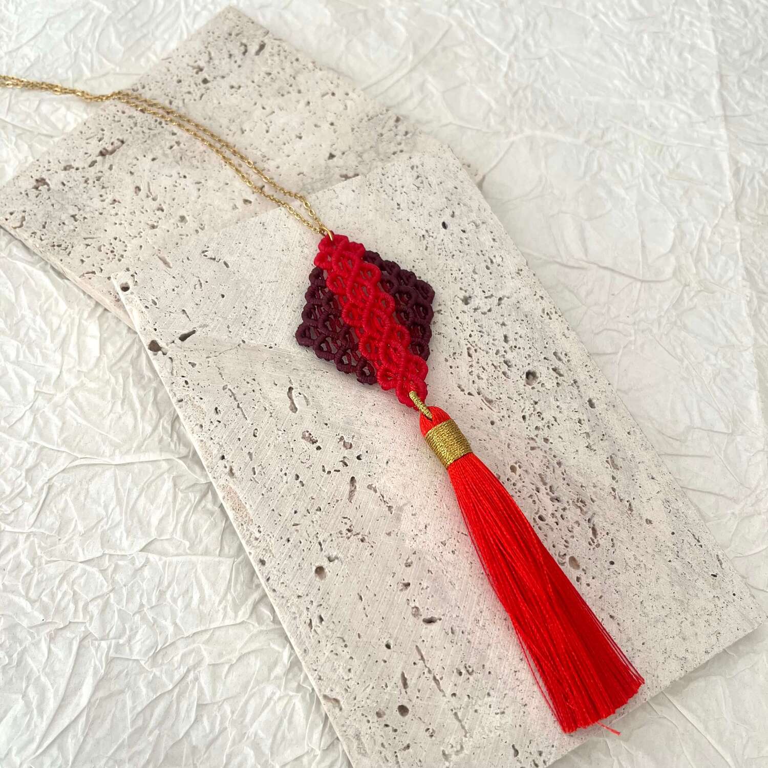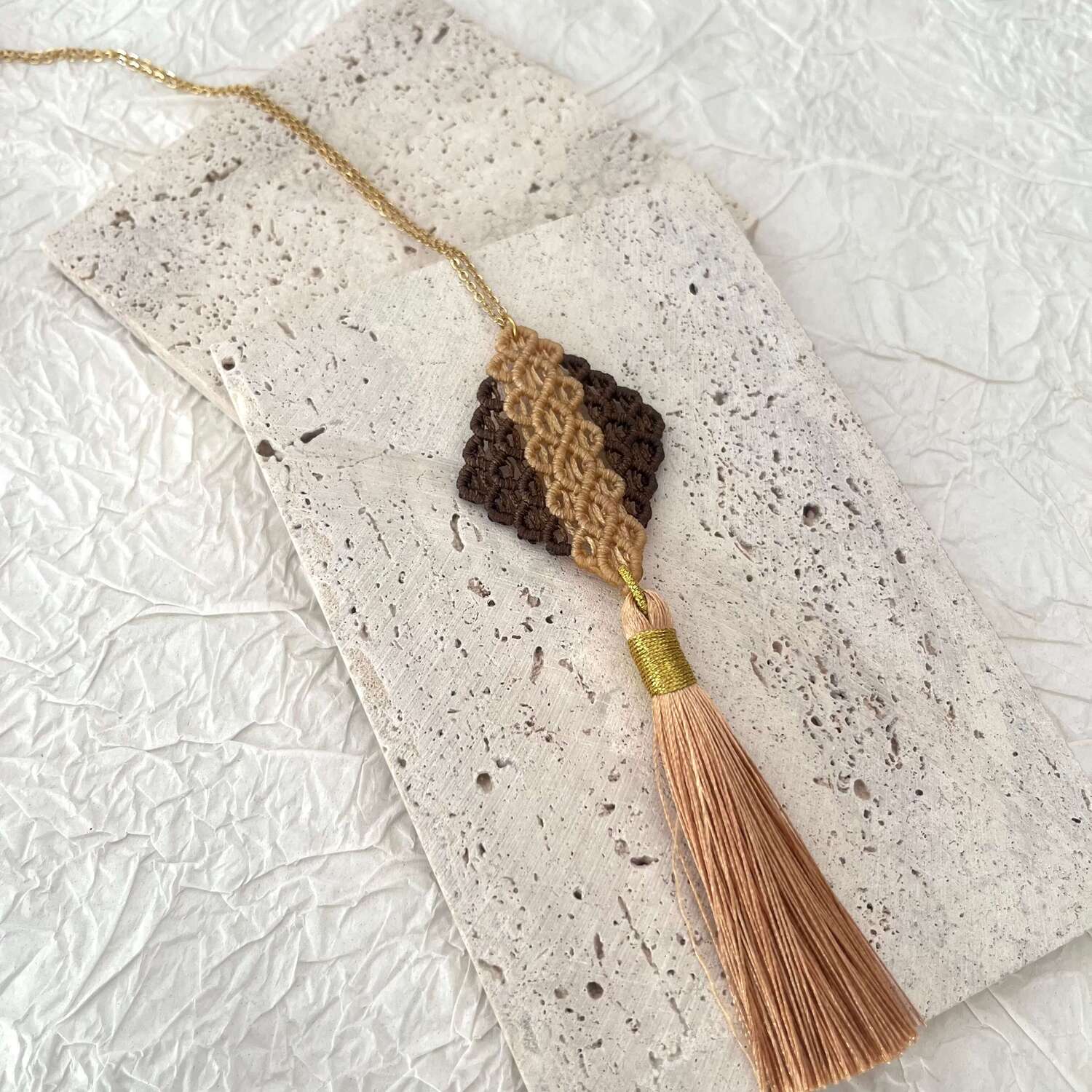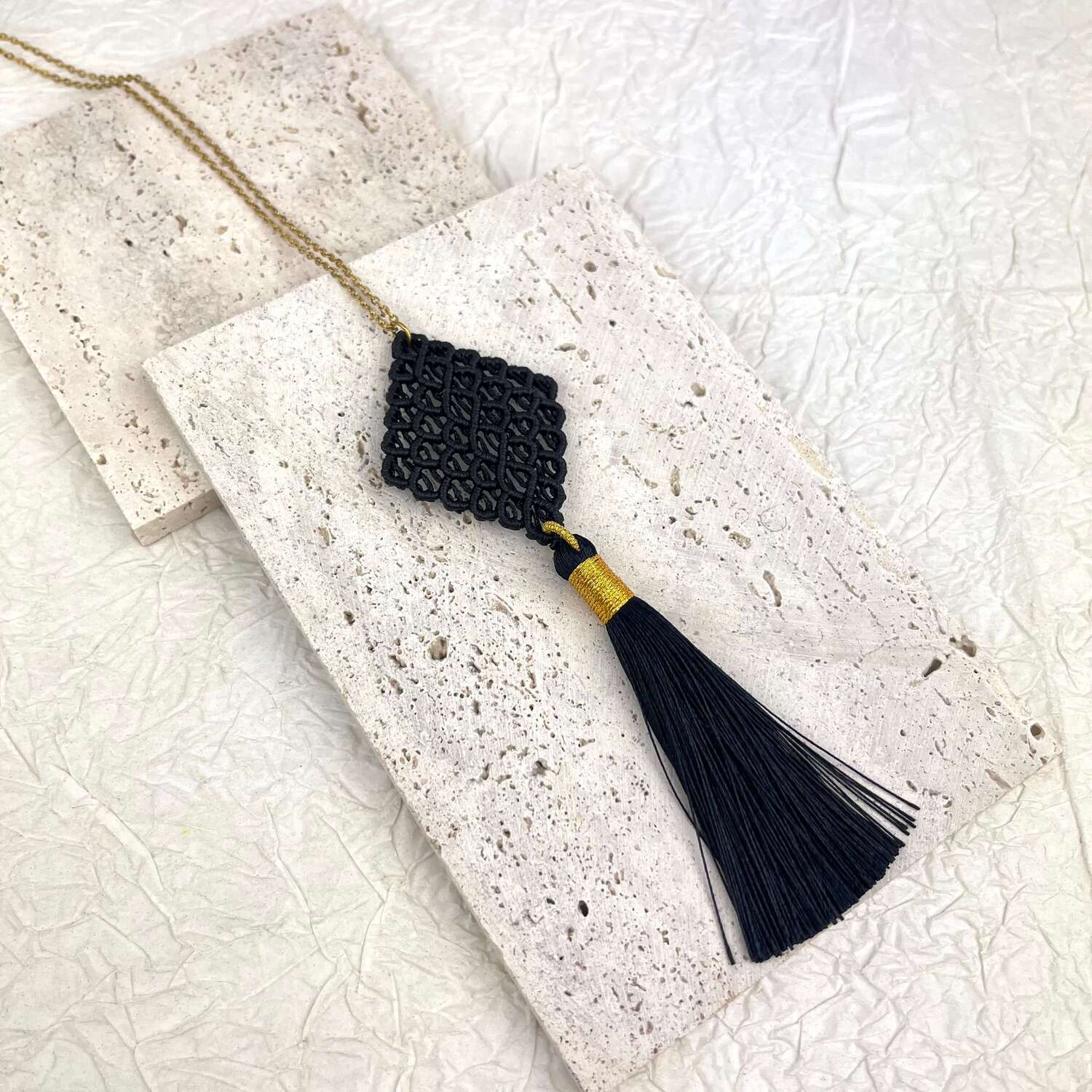 Το χειροποίητο μακραμέ κολιέ «Κυψέλη» είναι ένα κόσμημα που συνδυάζει την παραδοσιακή τέχνη του μακραμέ με σύγχρονη κομψότητα. Το γεωμετρικό μοτίβο του θυμίζει κυψέλη, σύμβολο αρμονίας, δημιουργίας και ισορροπίας. Είναι πλεγμένο στο χέρι με προσοχή στη λεπτομέρεια και ολοκληρώνεται με πολυτελή μεταξωτή φούντα, που προσθέτει κίνηση και χαρακτήρα. Ένα ξεχωριστό κόσμημα που φοριέται μόνο του και τραβάει τα βλέμματα, ή συνδυάζεται εύκολα με άλλα minimal κοσμήματα.