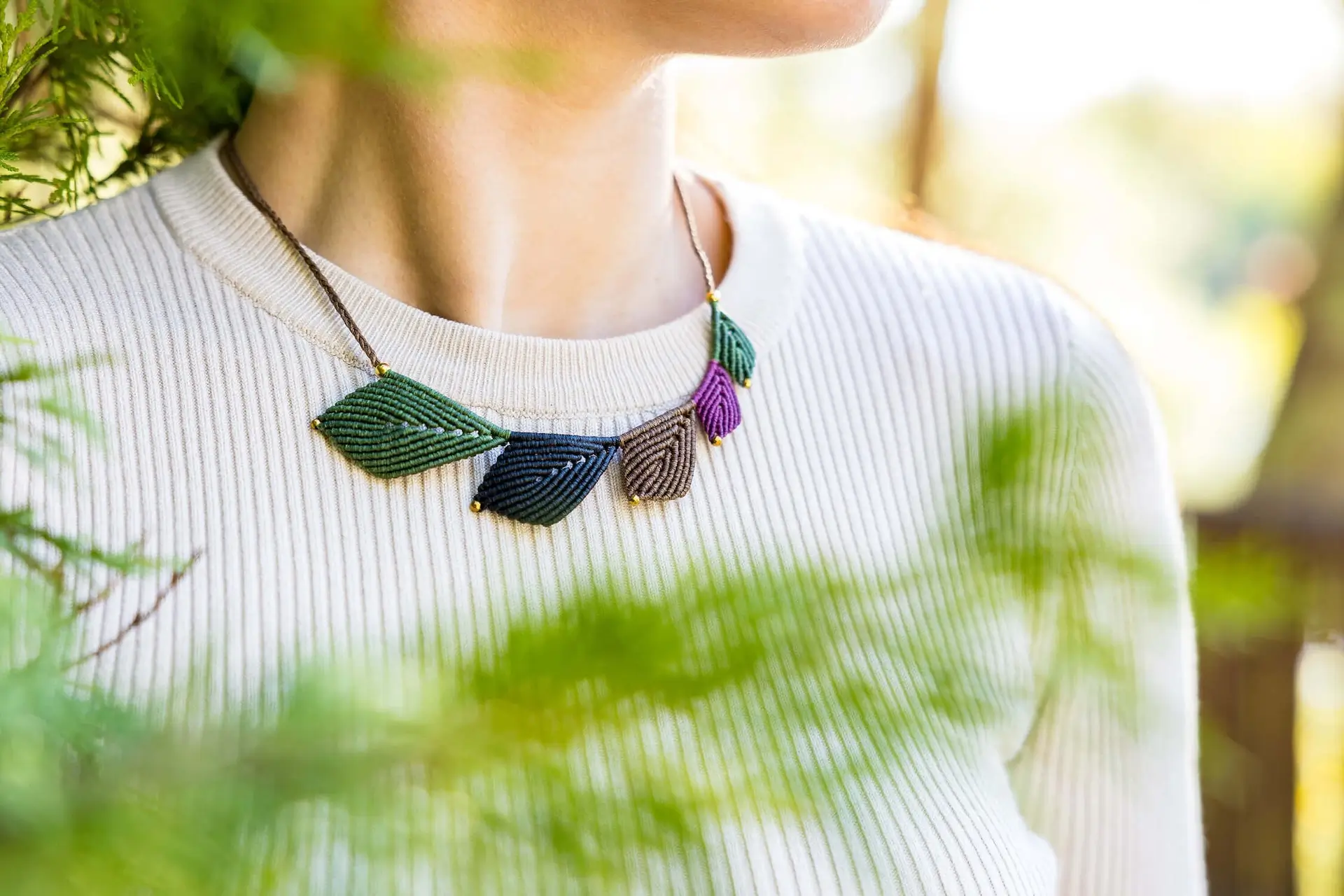 100% Χειροποίητο μακραμέ κρεμαστό με φύλλα και ημιπολύτιμες πέτρες αιματίτη.